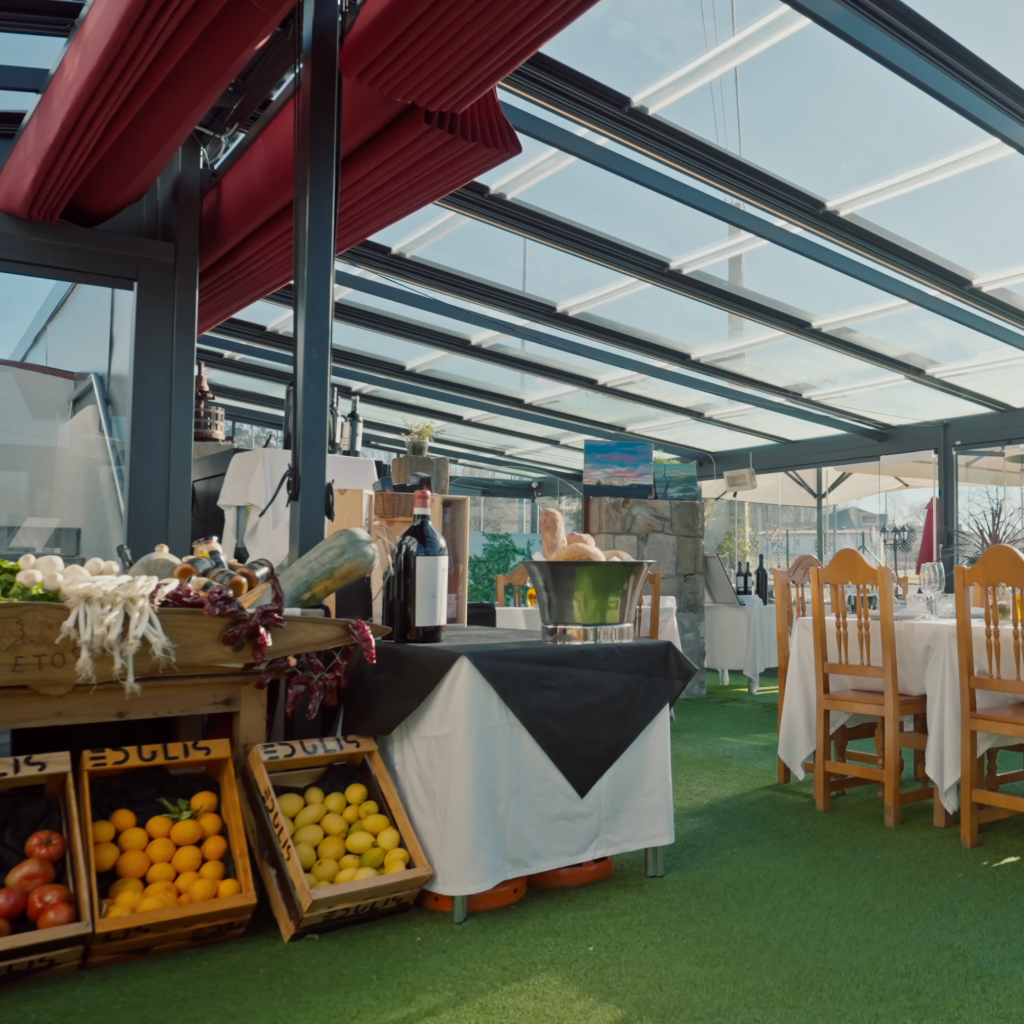 En Edulis Jatetxea, ubicado en  Maruri, hemos transformado su terraza en un espacio versátil y lleno de luz. Instalamos un techo móvil sin marcos horizontales y el sistema de cortinas de cristal abatibles y correderas.