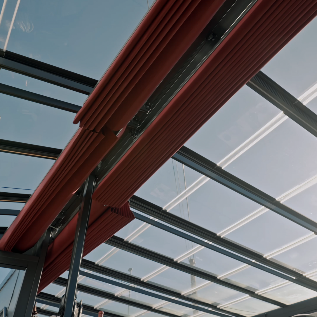 Techo móvil motorizado sin marcos horizontales y cerramiento vertical con cortinas de cristal